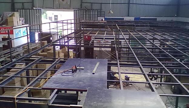 1、柱截面可以采用直徑為120MM的鋼管,梁采用H200X120X6X8的焊接工字鋼,中間次梁采用槽鋼120X6間距1000MM;短向布置,次梁直接再用角鋼50X4拉結,間距500MM,再鋪木板或壓花鋼板,每平方米重量為80公斤左右(鋼板),鋪木板為每平方米60公斤。
