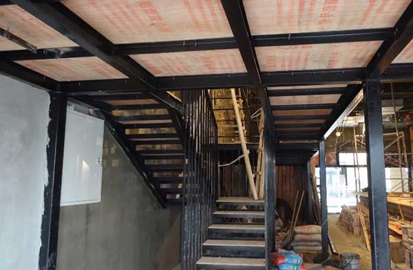 2.全鋼結構是以工字鋼做主梁平接,角鋼為輔梁墻筋連接主梁。至于工字鋼的分割是按壓型鋼板的尺寸而定的。全鋼結構的優點是隔音且不易變形,閣樓上還可做衛生間,防水效果好。缺點就是,比較重,墻體受力較大。